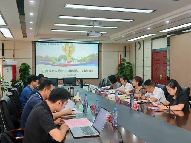 9月29日,江西信息应用职业技术学院教务处处长郑朝晖带队一行7人来我校调研,教务处处长彭晔、计划财务处处长邬啸峰、工业机器人技术专业群负责人马龙凤、信息工程系主任夏昕及教务处副处长傅艳华参加。